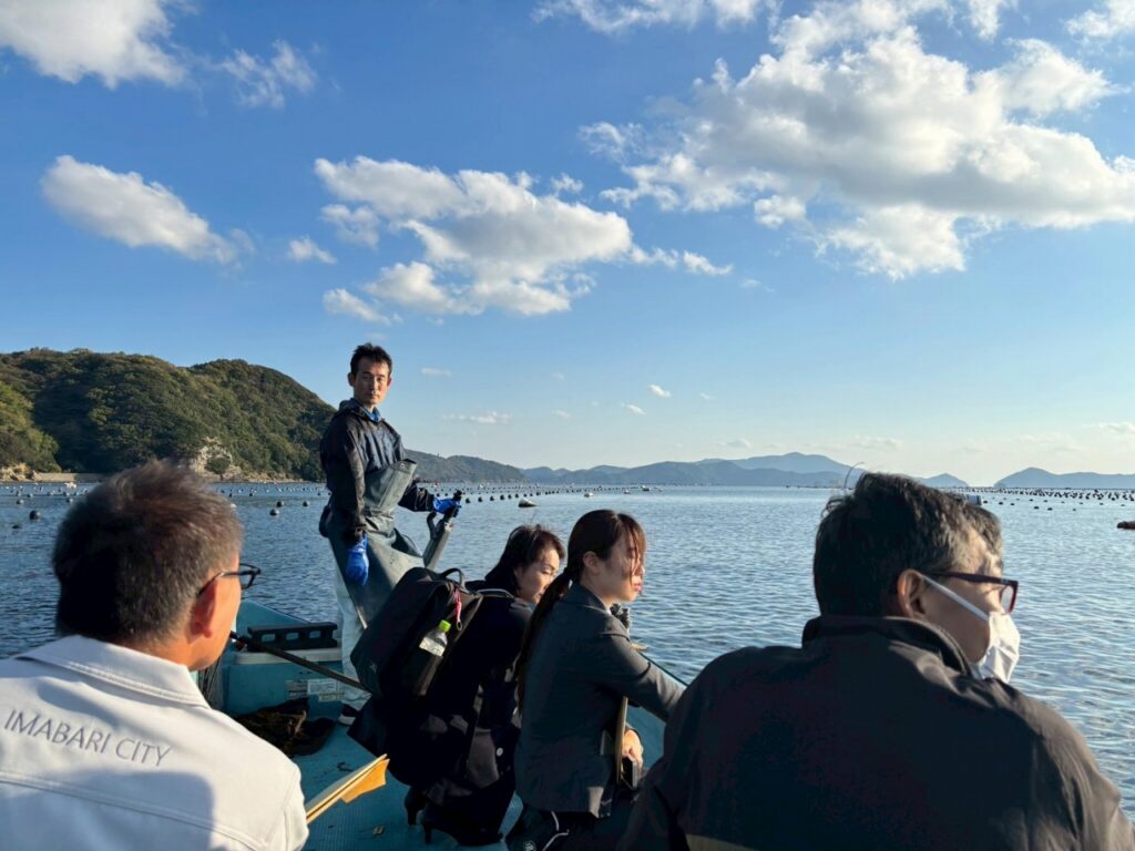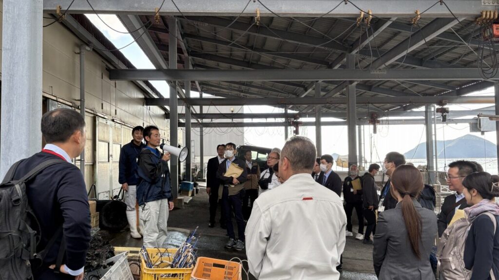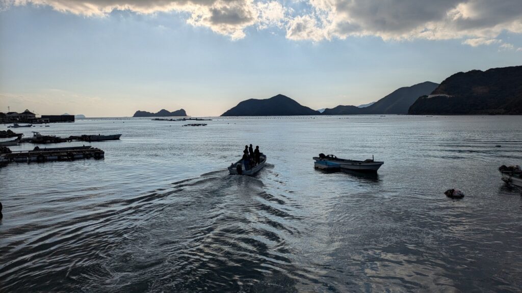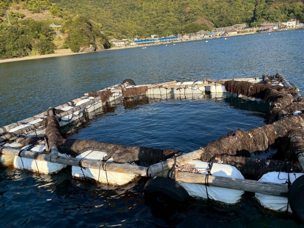 家串漁港で真珠母貝養殖筏(Jブルークレジット認証海域)と真珠母貝作業の見学を行いました。