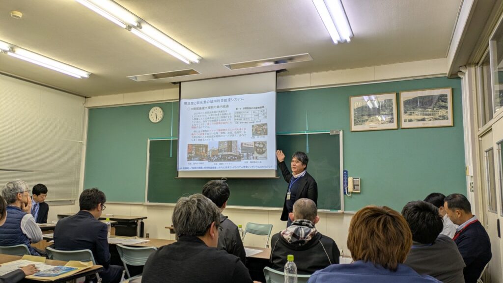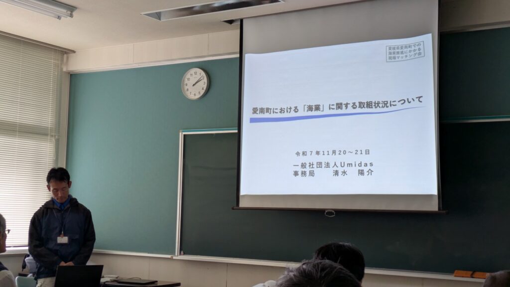 愛南町水産課の山本課長と水産庁による挨拶の後、一般社団法人 Umidas(ホームページ) 事務局の清水陽介さんが「愛南町の海業」について取組の概要を紹介してくれました。