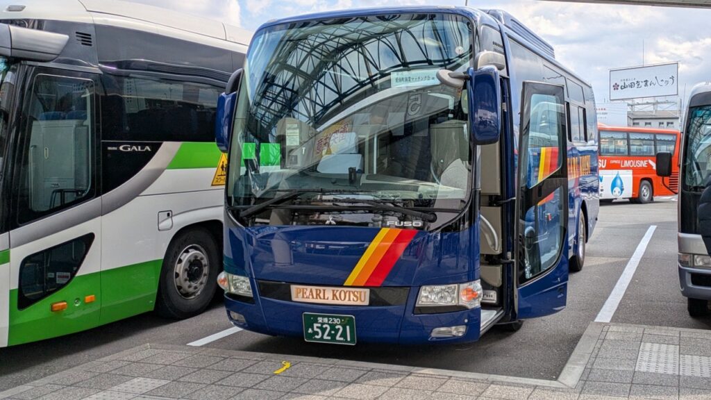 松山空港より飛行機でやってきた皆様を乗せ出発です。豪華なバスを貸し切りです。