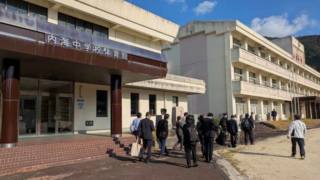 第一目的地である、旧内海中学校に到着。現地集合で参加の方もここで加わりました。